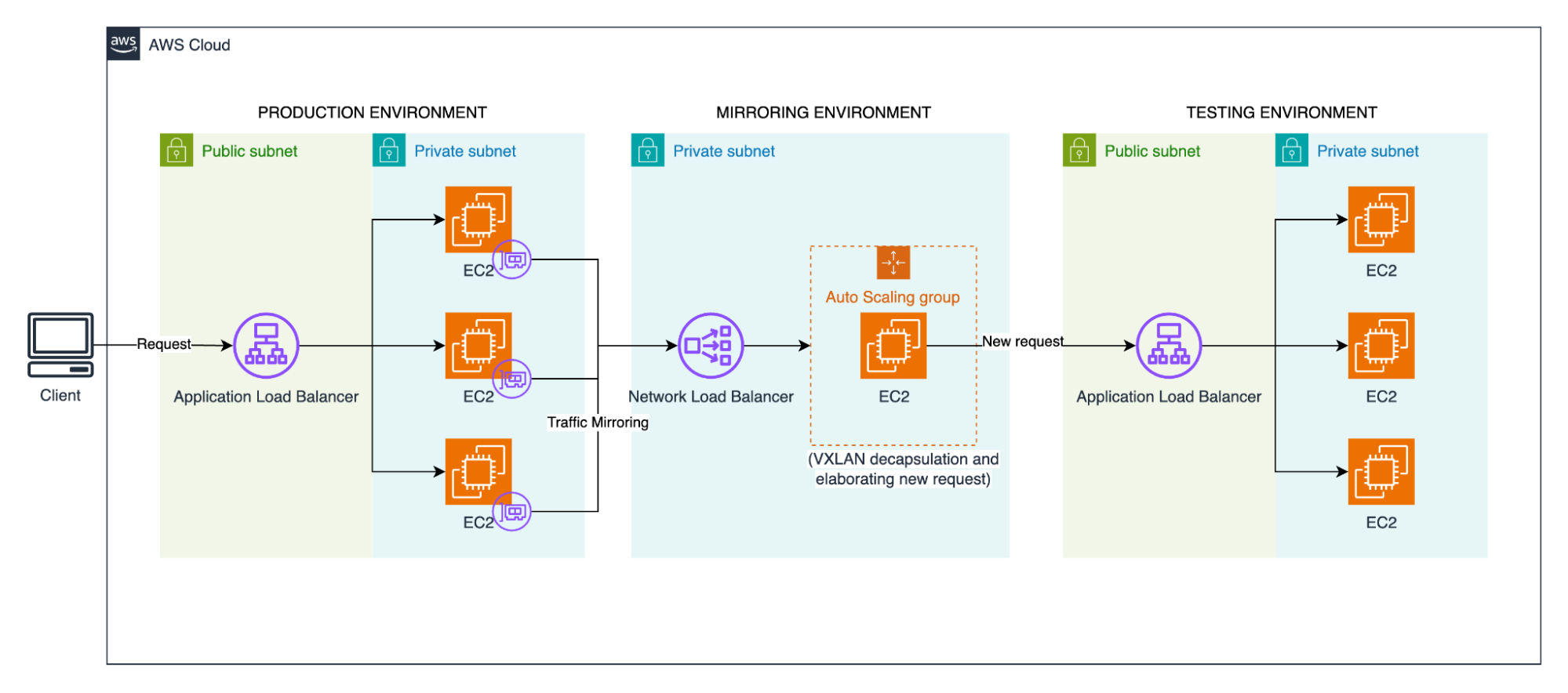 Second, we deployed our mirroring environment. We set up an AWS Network Load Balancer in front of an AWS Auto Scaling group of Amazon EC2 instances. On these instances, we installed a lightweight open-source tool (like this one) to handle the VXLAN decapsulation and forward the traffic to our shadow AWS ALB. This gateway was the bridge between the mirrored world and our test environment.