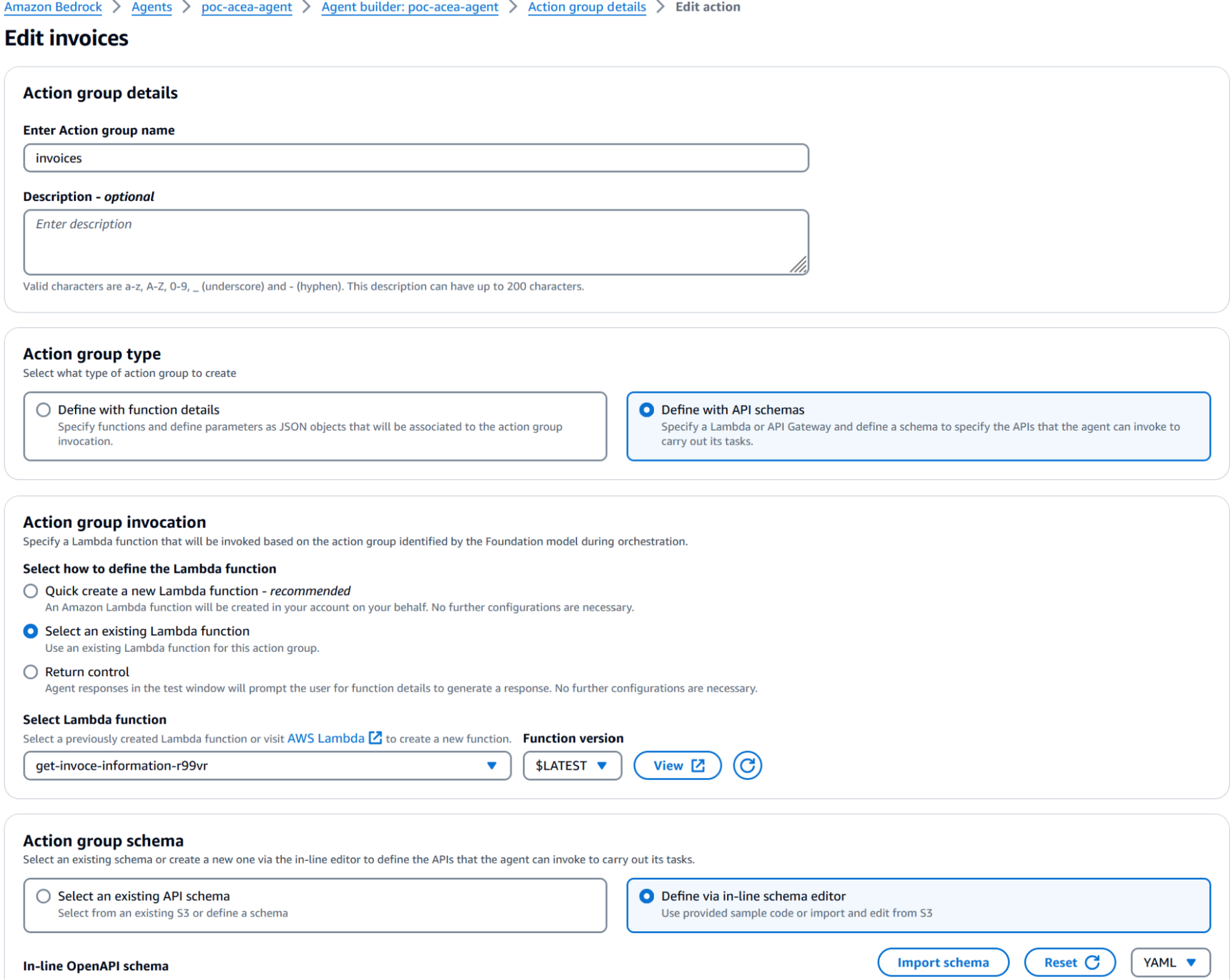 Now that we have the Lambda function we can go on and add the Api actions and register the KB in the agent we created before: go back to the agent dashboard and edit the agent by adding the knowledge base and adding a new action group.