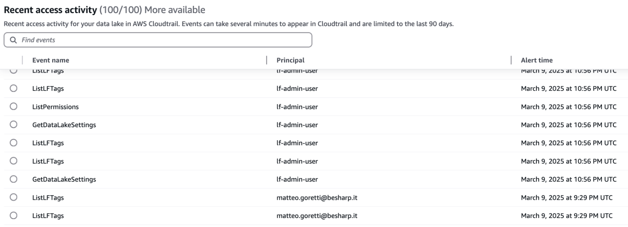 AWS LakeFormation offers a centralized dashboard that security teams can use to review all data access events. This centralization enables more effective governance, simplifies compliance, and faster audit responses.