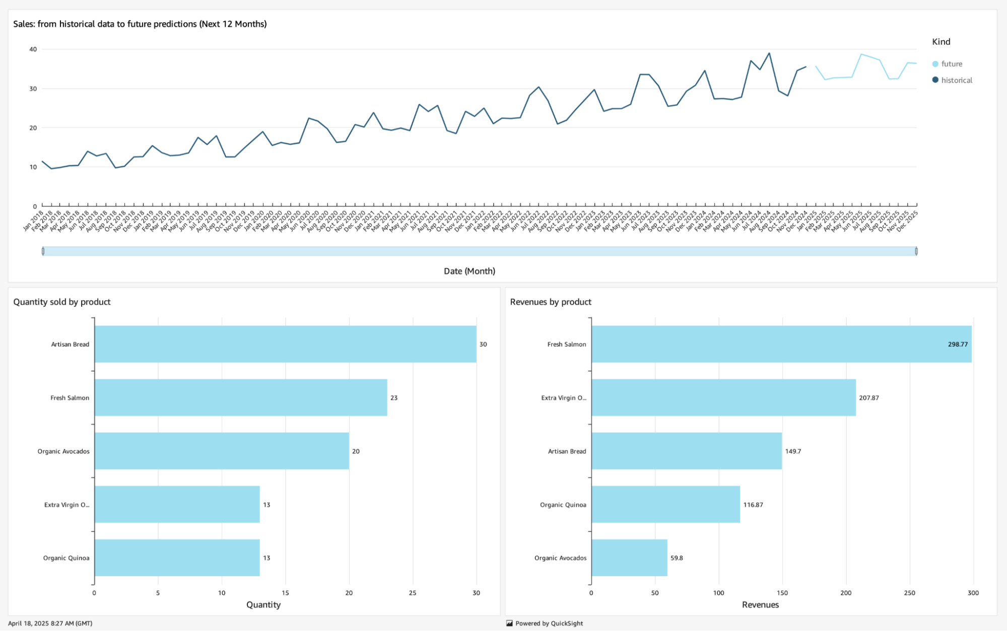 We can use a line chart to plot future sales data, differentiating historical data from our predictions. Meanwhile, bar charts can be used to show how products are selling with respect to quantity and revenues.