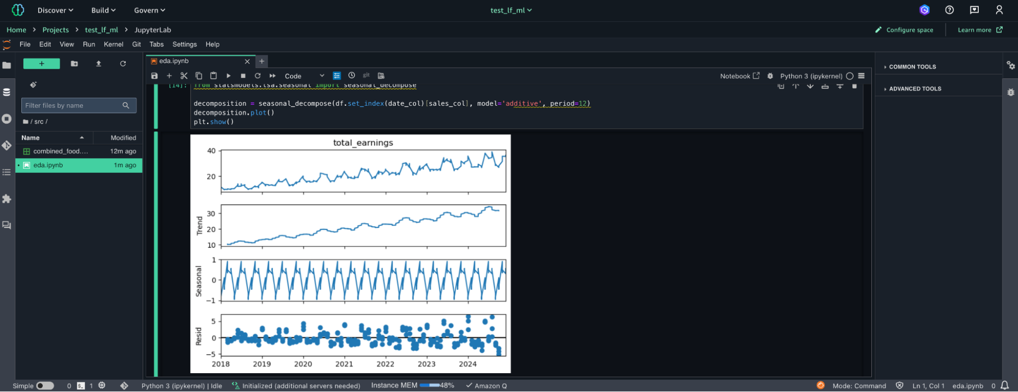 We explored the SageMaker Unified Studio Experience, performing exploratory data analysis (EDA) using notebooks, and, creating an AI model able to forecast future time-series data, using Pipelines and the Model Registry.