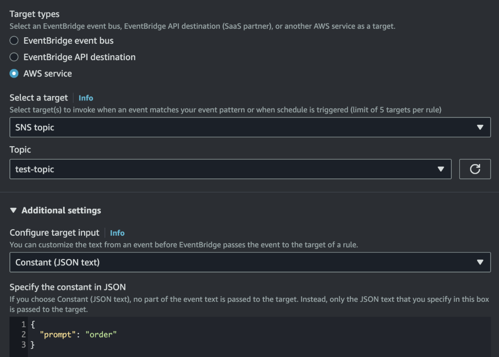 }(Under the hood, EventBridge treats InputTemplate as a string and substitutes the <...> variables before delivering the payload.)Sometimes the event content doesn't matter at all—you just need to trigger a target with a predefined payload.