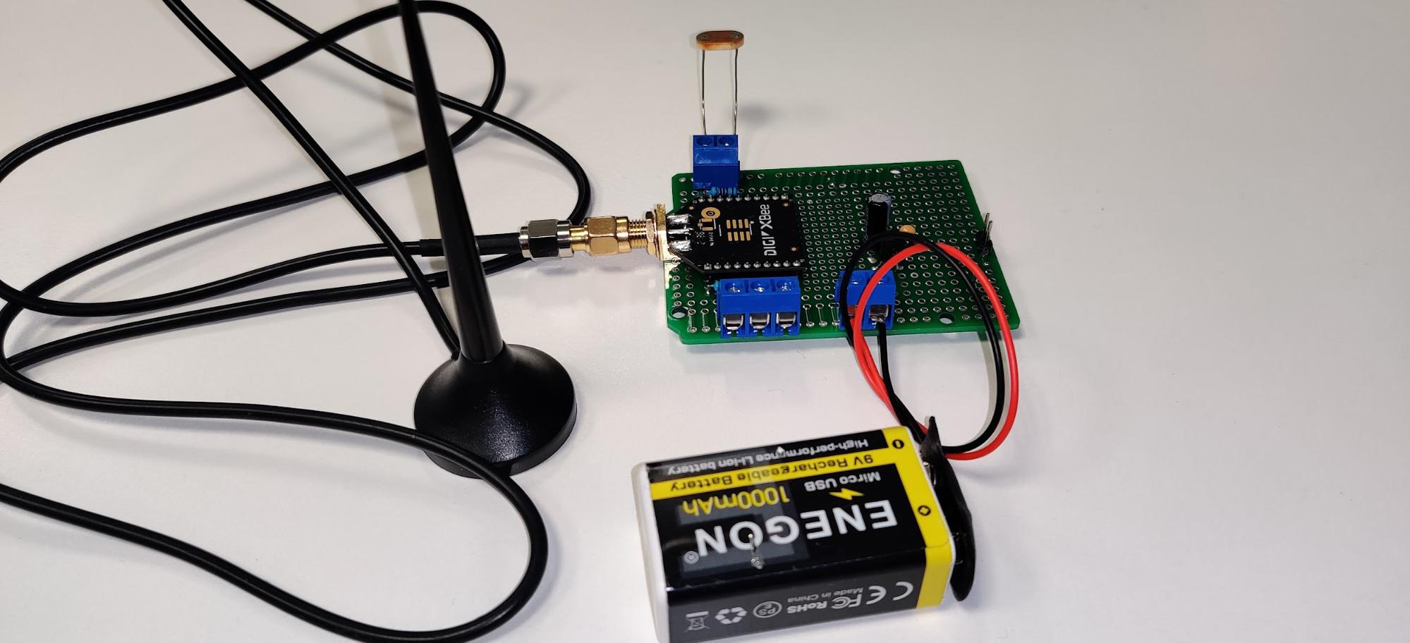 Per preparare il terreno, abbiamo sviluppato in modo rapido e frugale un sensore wireless utilizzando un modulo XBee, un regolatore di tensione e una fotoresistenza.