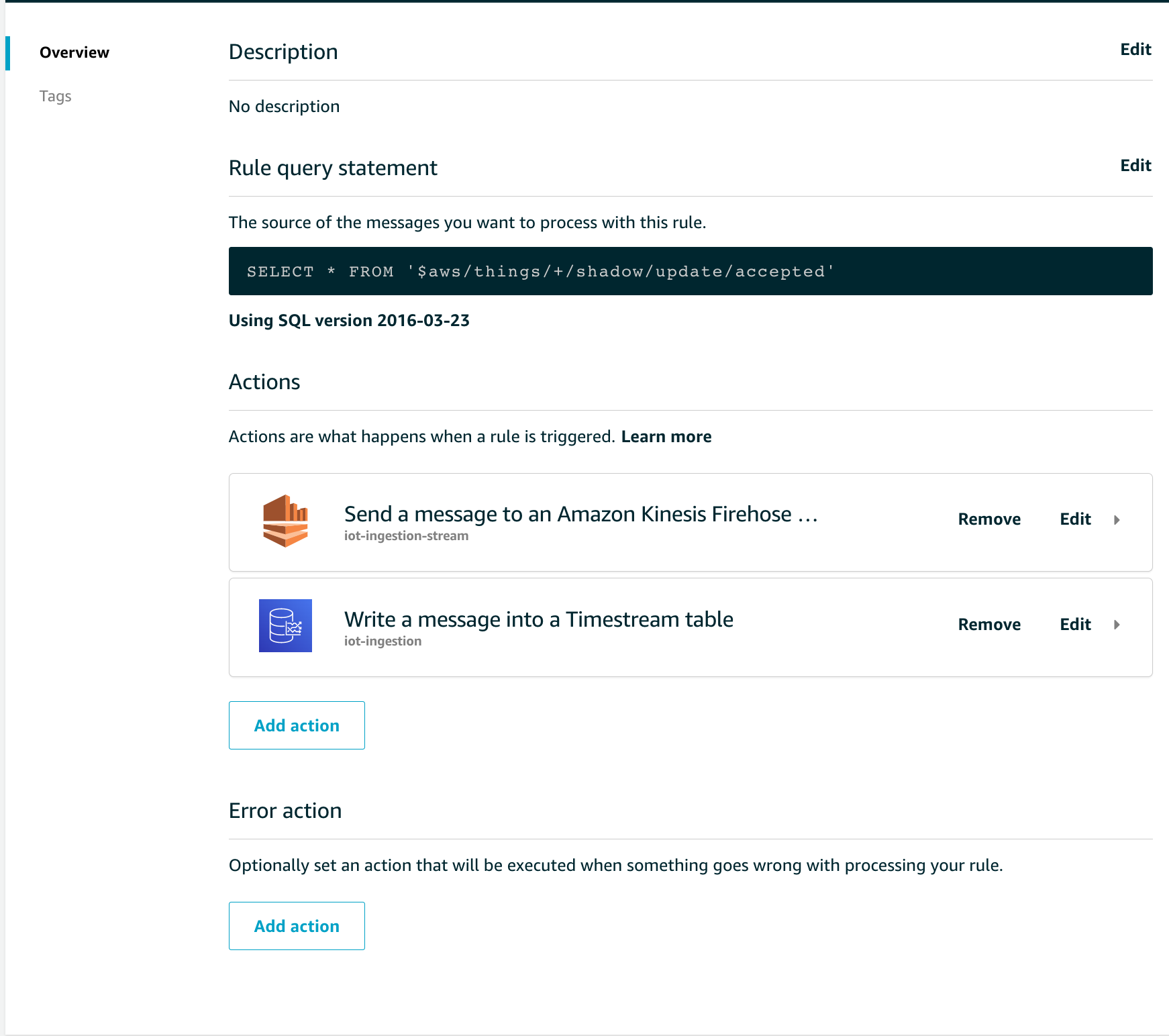 Nella sezione Rule query statement si può notare come vengano selezionati tutti i parametri in ingresso sul topic $aws/things/+/shadow/update/accepted.