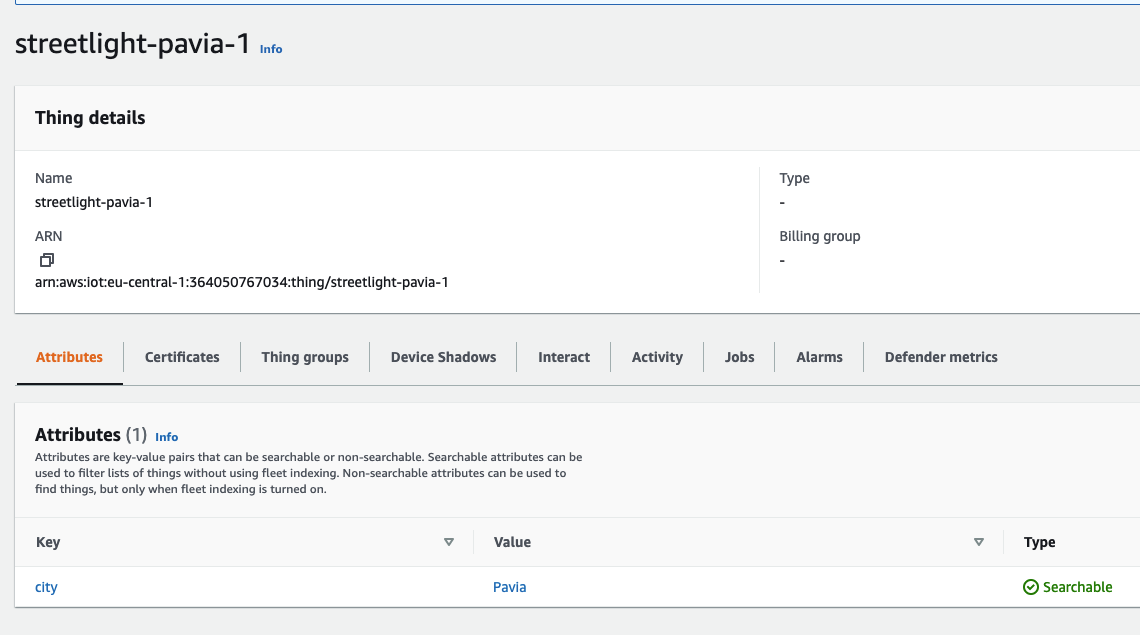 Entrando nella sezione AWS IoT sulla console, sotto la voce di menù Manage, sarà possibile creare degli oggetti - Things, appunto - configurandone alcune proprietà, come la loro associazione a un gruppo, ad una categoria o ad una tipologia di billing. Inoltre, è possibile assegnare dei tag specifici (attributi) che potranno essere usati nell’intero ecosistema AWS IoT. Nel nostro caso, abbiamo assegnato come attributo il nome della città di appartenenza dell’oggetto: