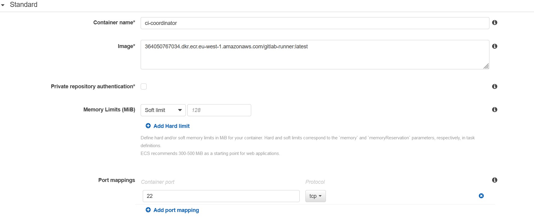 Configureremo le task definition per eseguire i runner nei nostri ambienti (gitlab-runner-dev-task, gitlab-runner-stage-task, gitlab-runner-prod-task).Attenzione: la task definition deve includere un container con nome "ci-coordinator". Occorre anche definire un port mapping per la porta 22 ed un security group che permetta le connessioni in entrata su quella porta: GitLab utilizza infatti una connessione ssh per l'esecuzione delle fasi della pipeline.