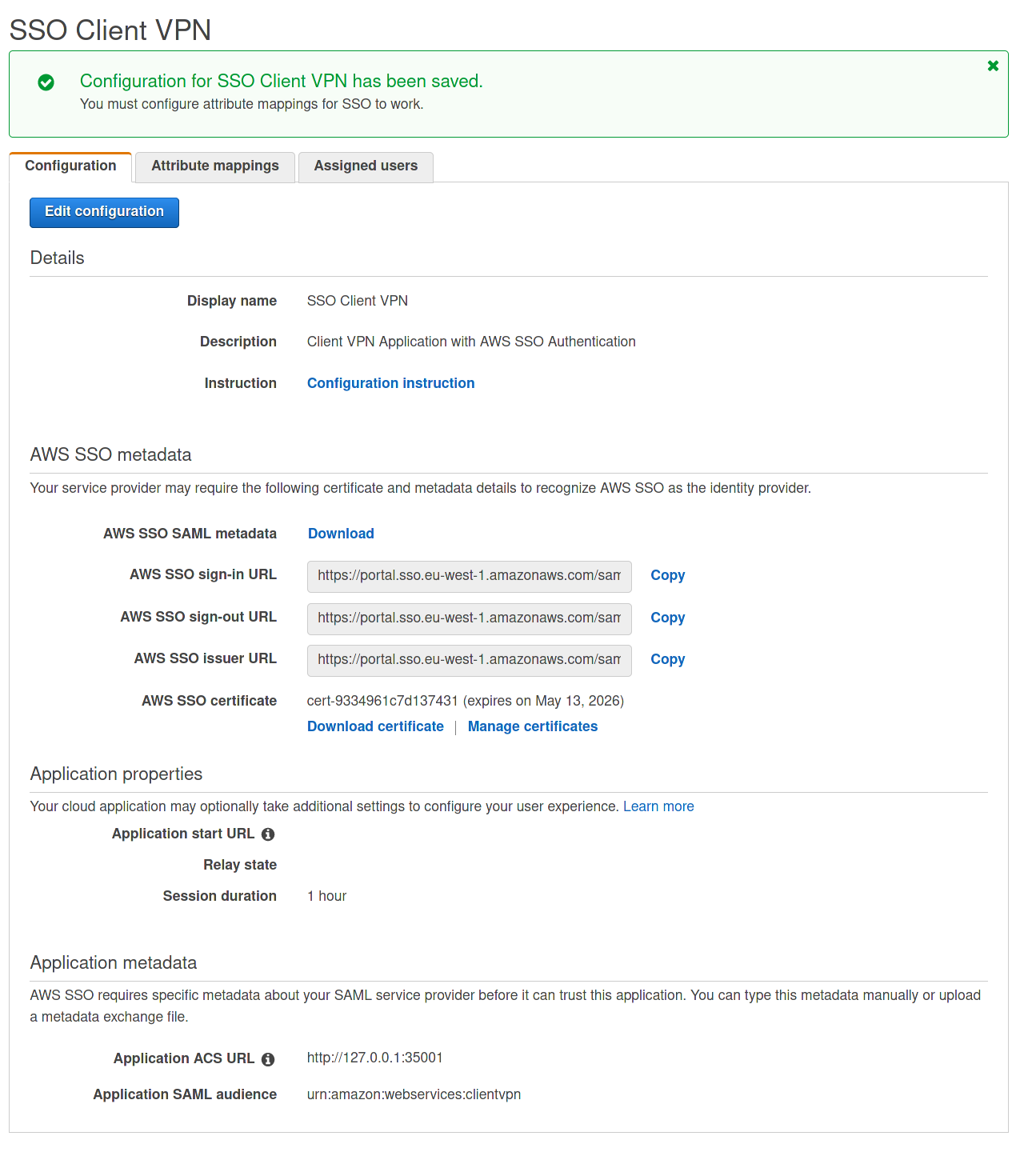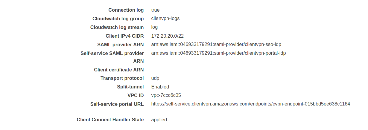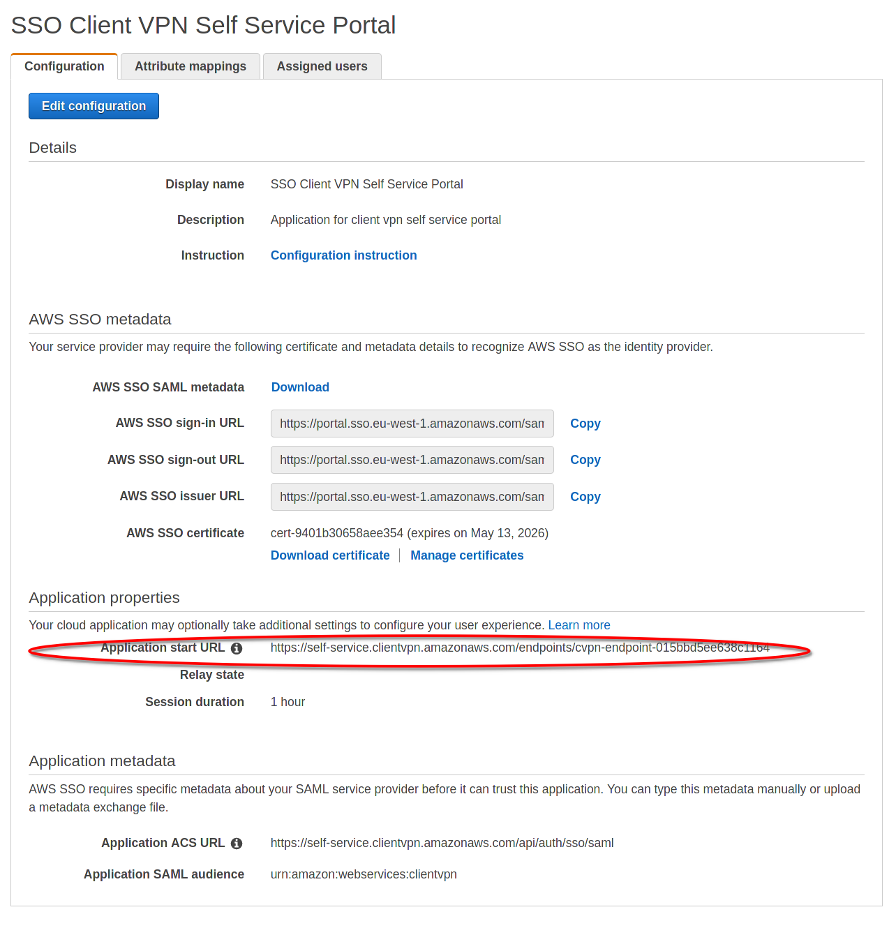 Application ACS URL: https://self-service.clientvpn.amazonaws.com/api/auth/sso/saml Application SAML Audience: urn:amazon:webservices:clientvpn