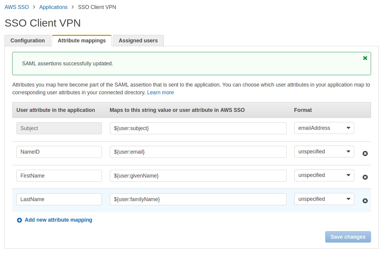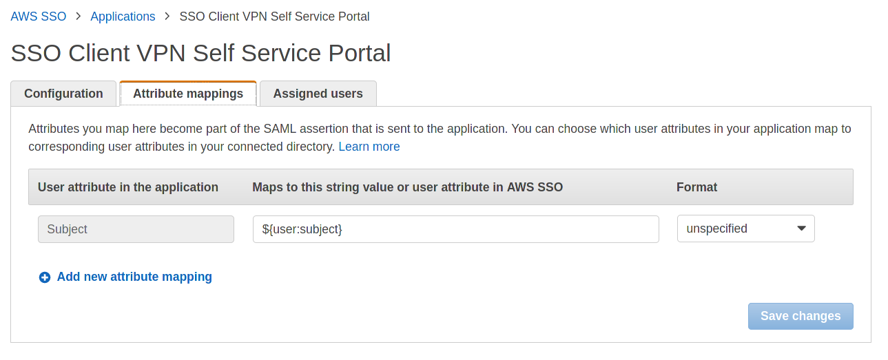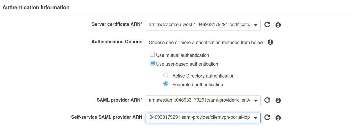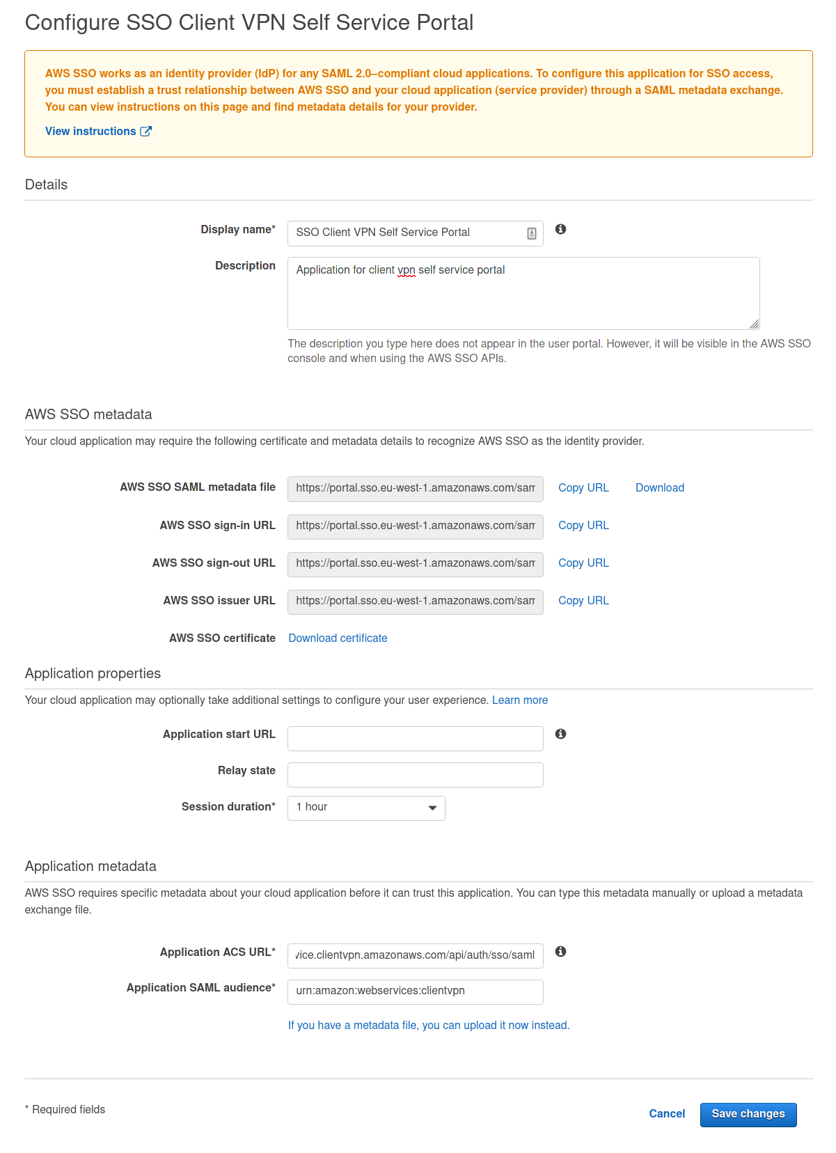 Application ACS URL: https://self-service.clientvpn.amazonaws.com/api/auth/sso/saml Application SAML Audience: urn:amazon:webservices:clientvpn