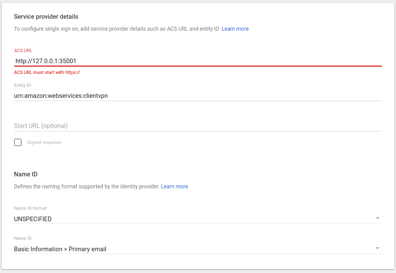Questo perché l’applicazione client esegue un servizio sul computer locale per validare e inoltrare i dati di autenticazione SAML. Questo è il motivo per cui l’autenticazione G Suite non è configurabile in modo semplice ed occorre una analisi più approfondita. Provando a configurare l’applicazione SAML in G Suite si ottiene infatti l’errore di validazione: