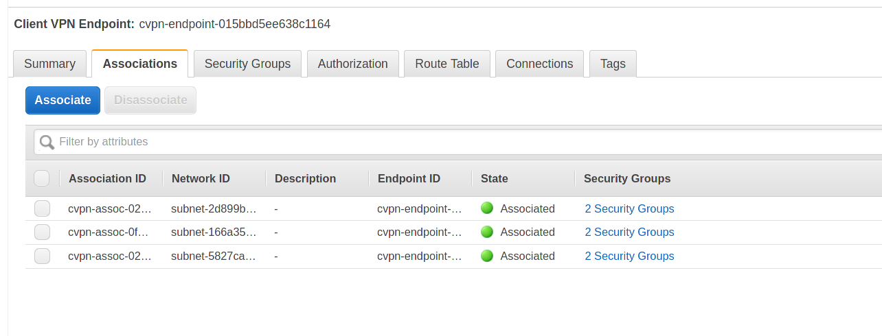 Cliccare sulla tab “Associations” sul Client VPN endpoint, selezionare la VPC di destinazione e la subnet (o le subnet) da associare. Dopo alcuni istanti lo stato cambierà in “associated”: