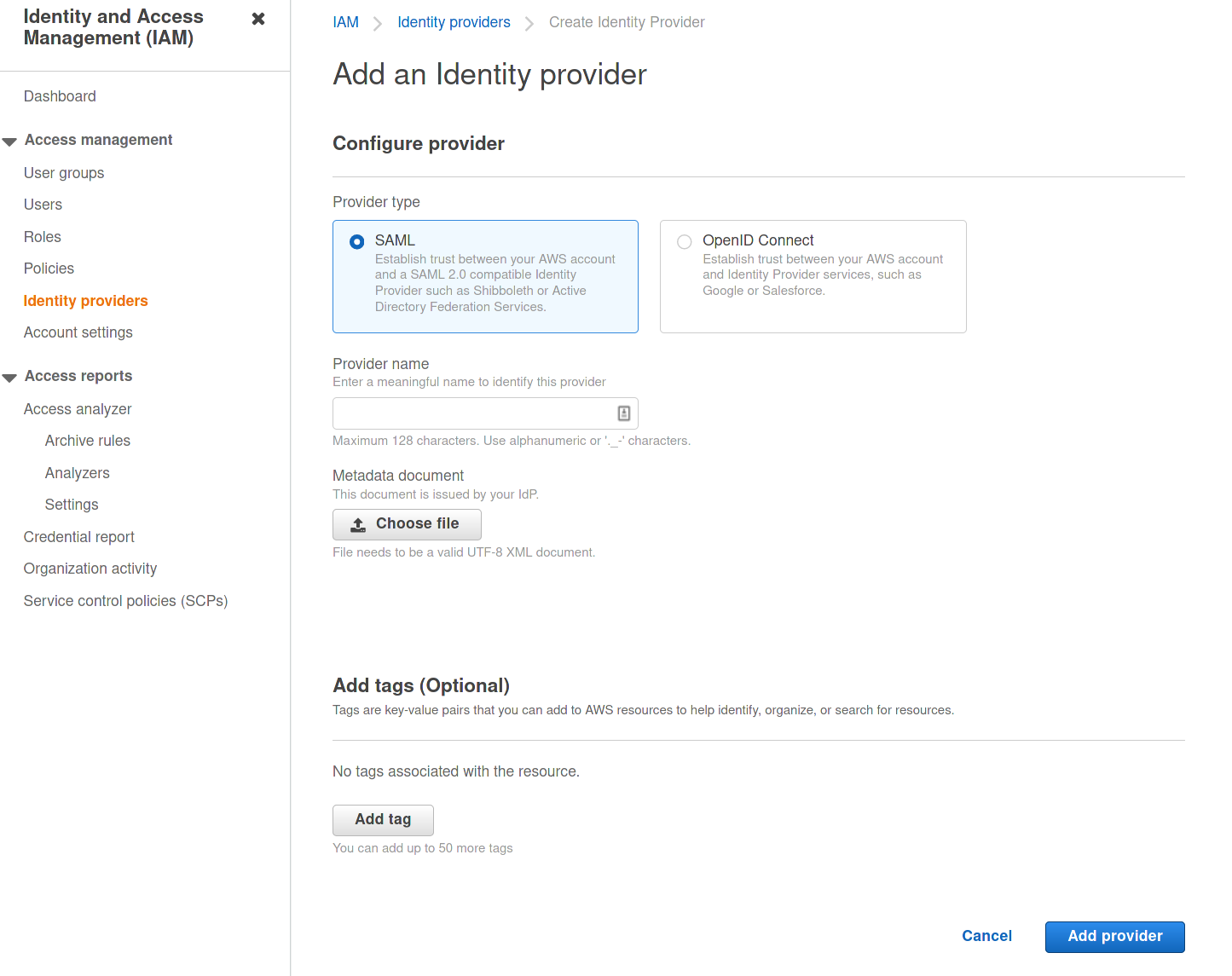 Sulla console dell’account “development” alla sezione "Identity Providers” di IAM fare click su “Add provider” >