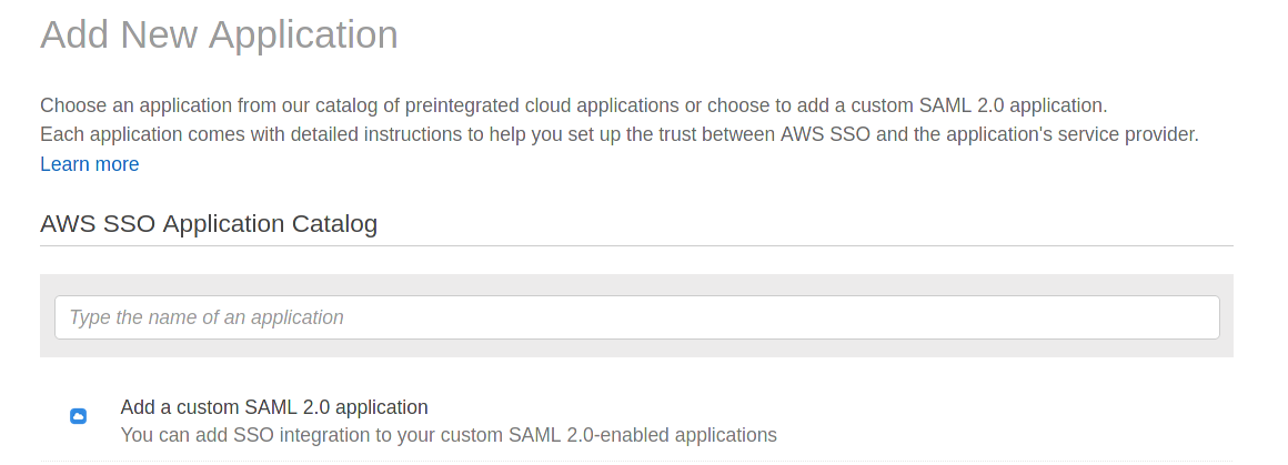 Nell’account master dell’organizatione selezionare “AWS Single Sign-On", “Applications”, “Add a new application”, “Add a custom SAML 2.0 Application”