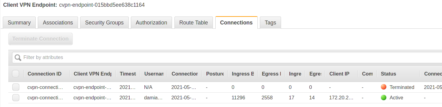 Sulla console alla sezione “Client vpn endpoints” usando la tab “Connections” si vedranno le connessioni: