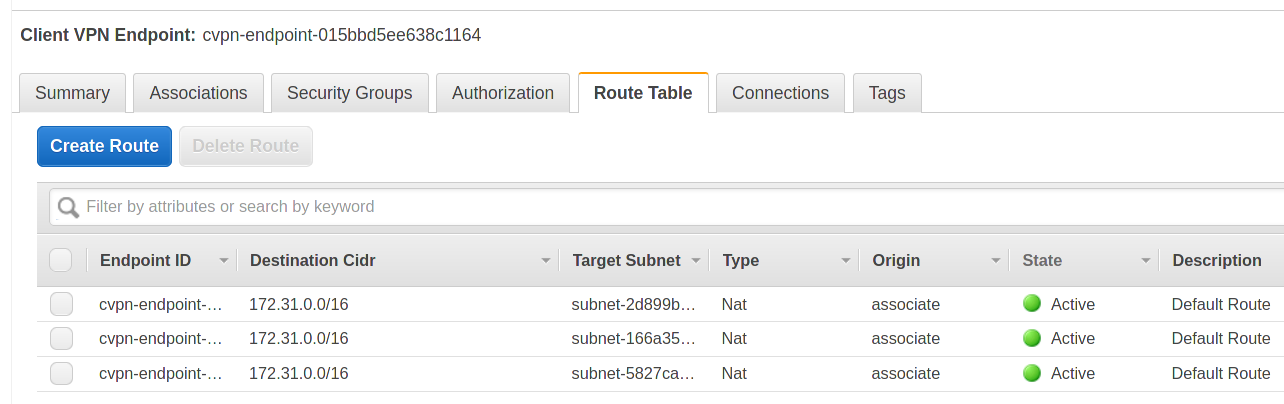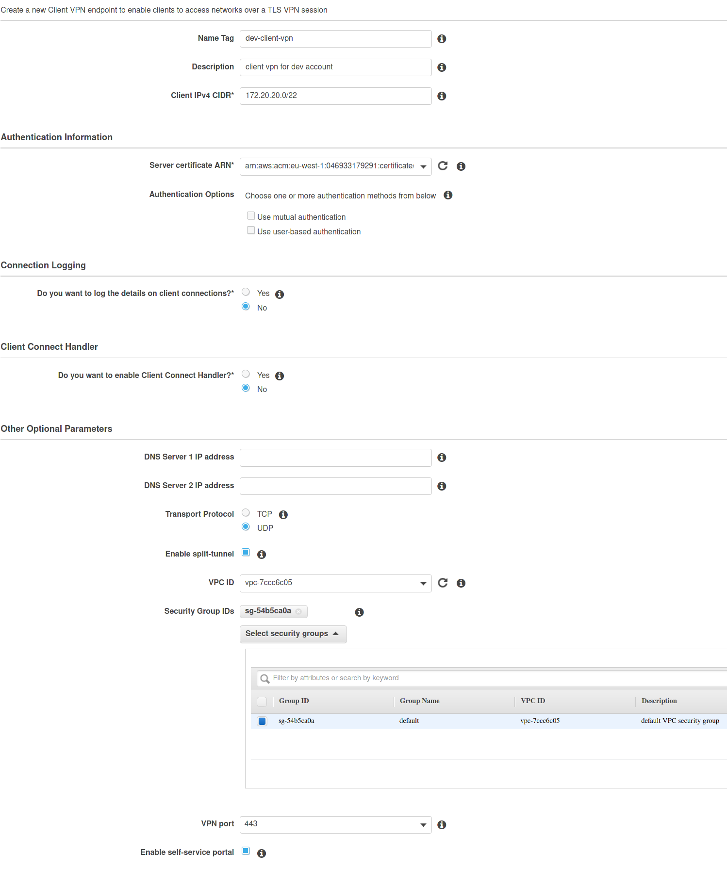 In the Development account go to VPC and select “Client VPN Endpoints”, create a new client vpn endpoint.