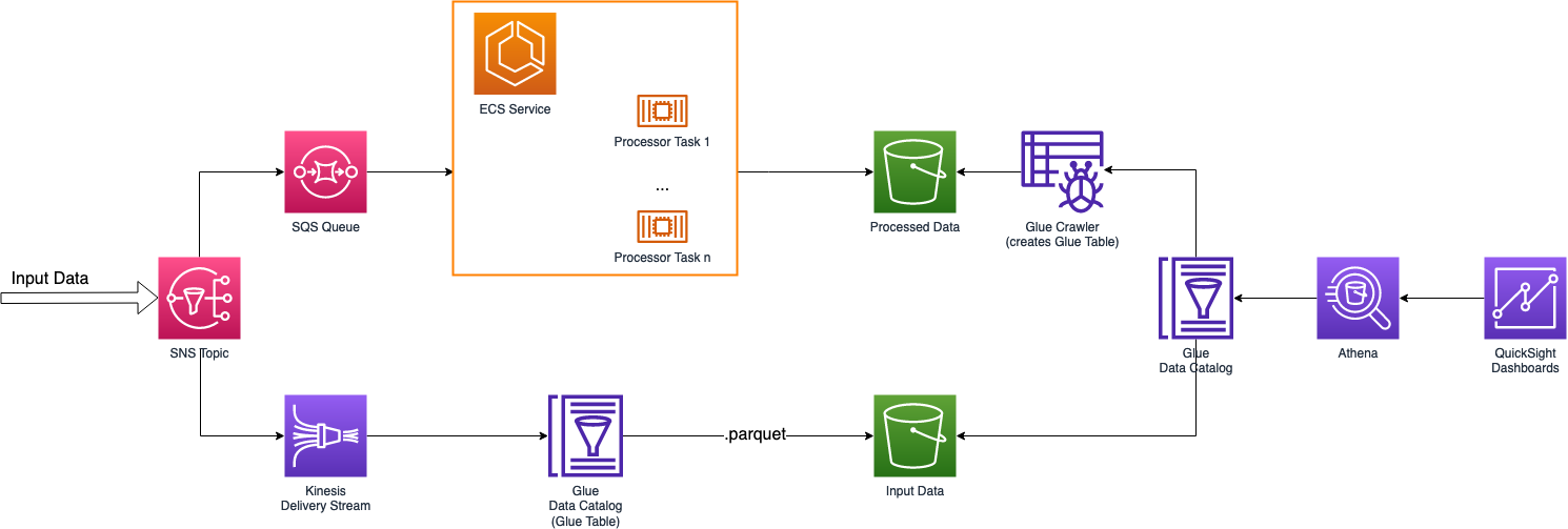 A delivery stream will batch our input data for short periods of time, or up to a given threshold of MBs, storing it in a compressed format, like parquet or orc, on S3. The SNS topic will direct data to both Kinesis and the processor; therefore, we can set 3 minutes to batch the input.