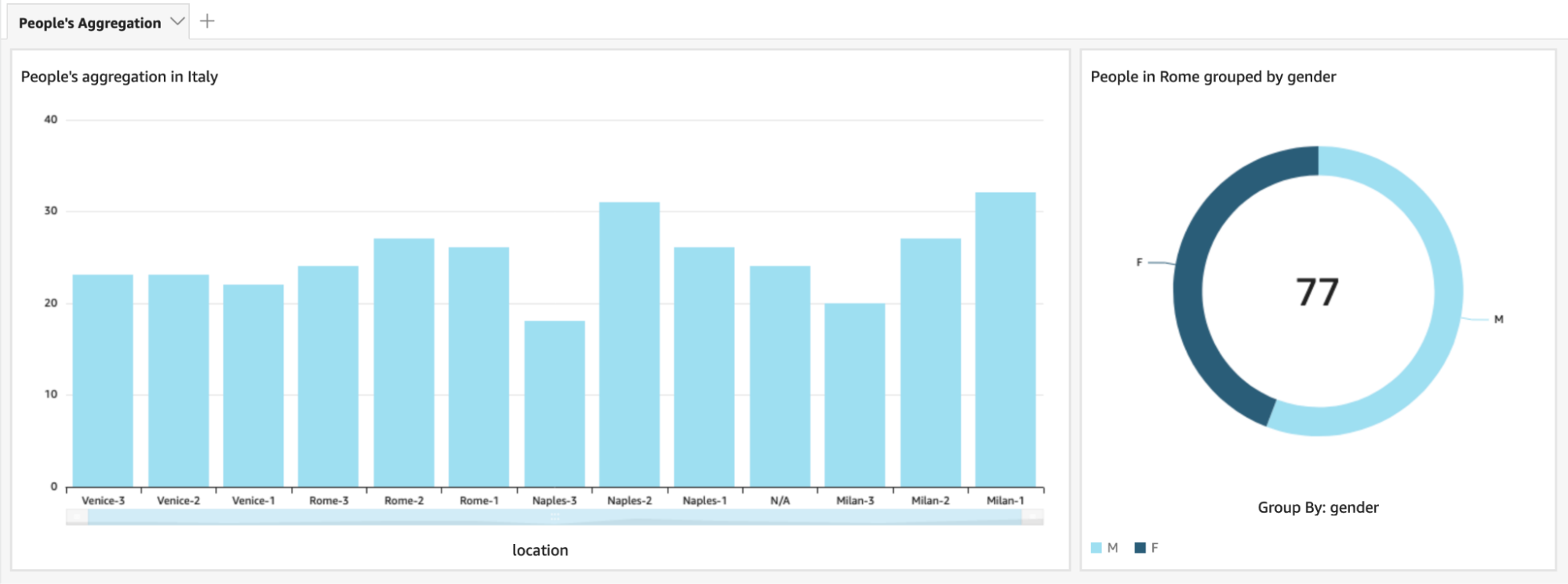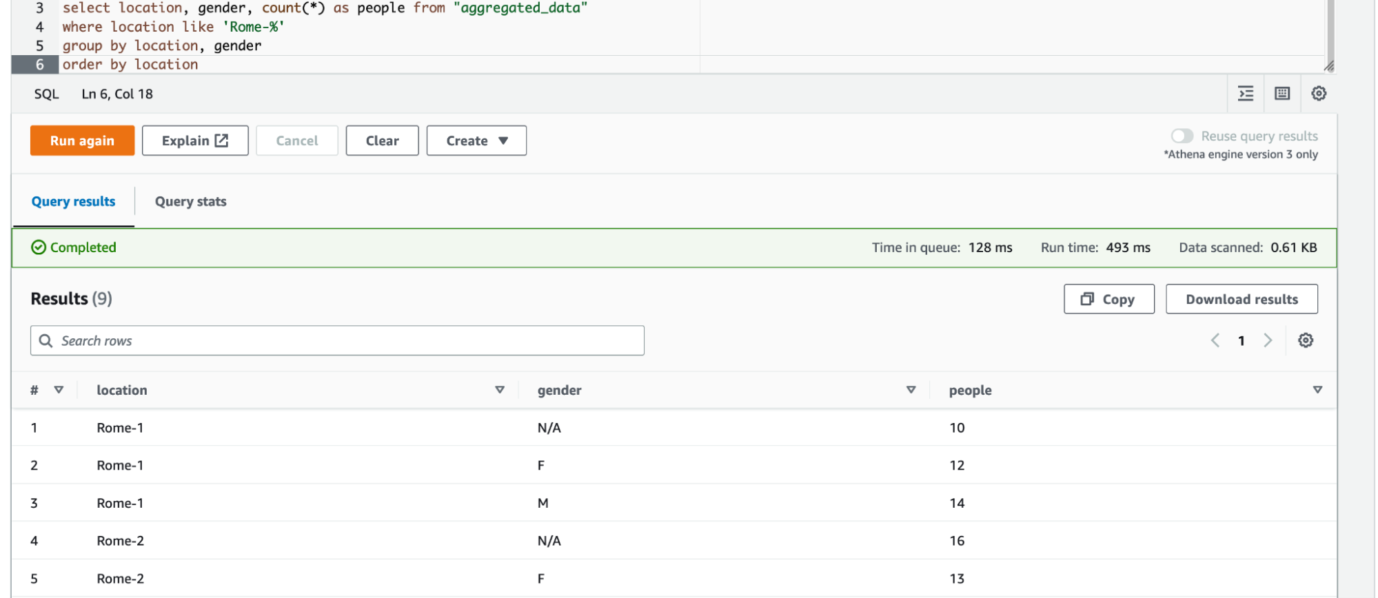 Now we can easily query our data, both input and aggregated, with Athena, gaining information, as an example, about the number of people around interest points, grouped by gender.