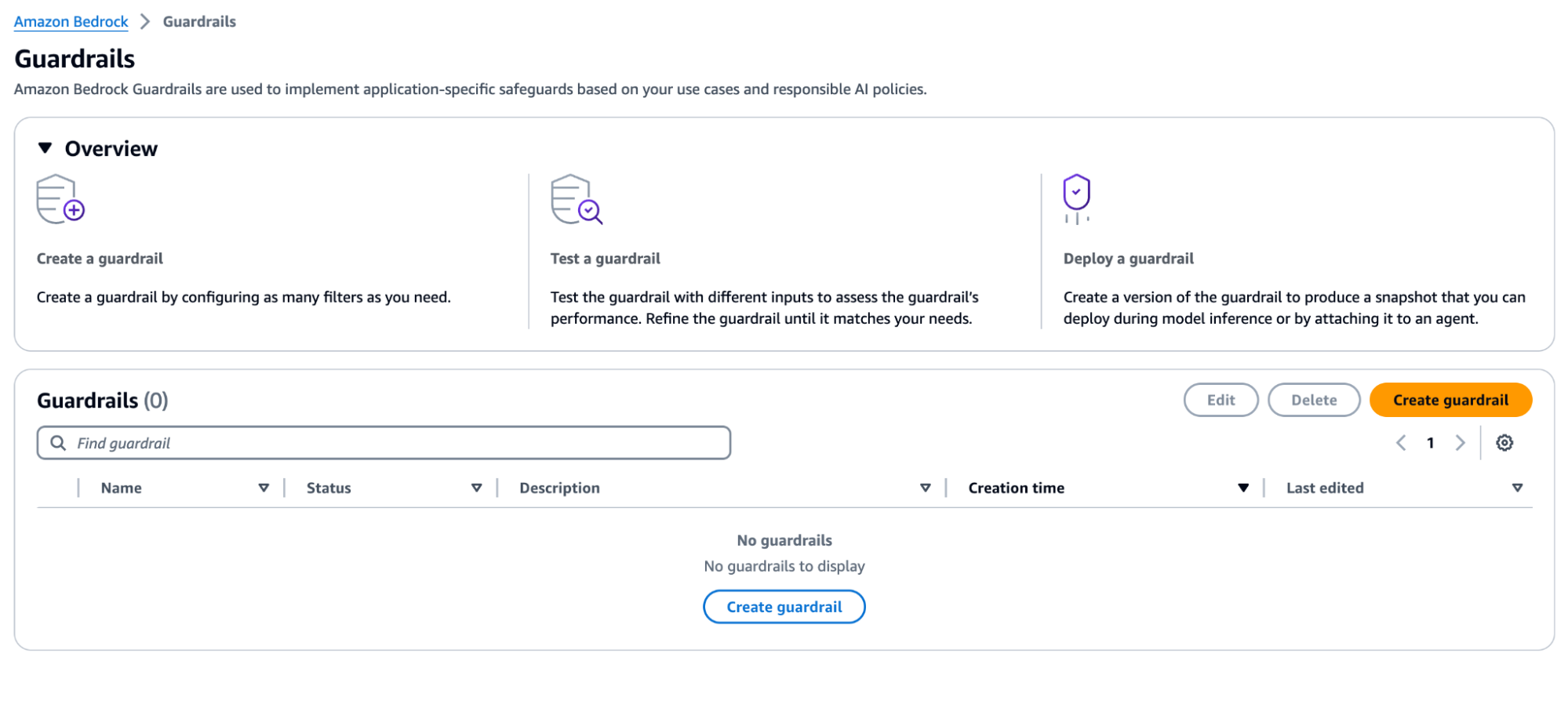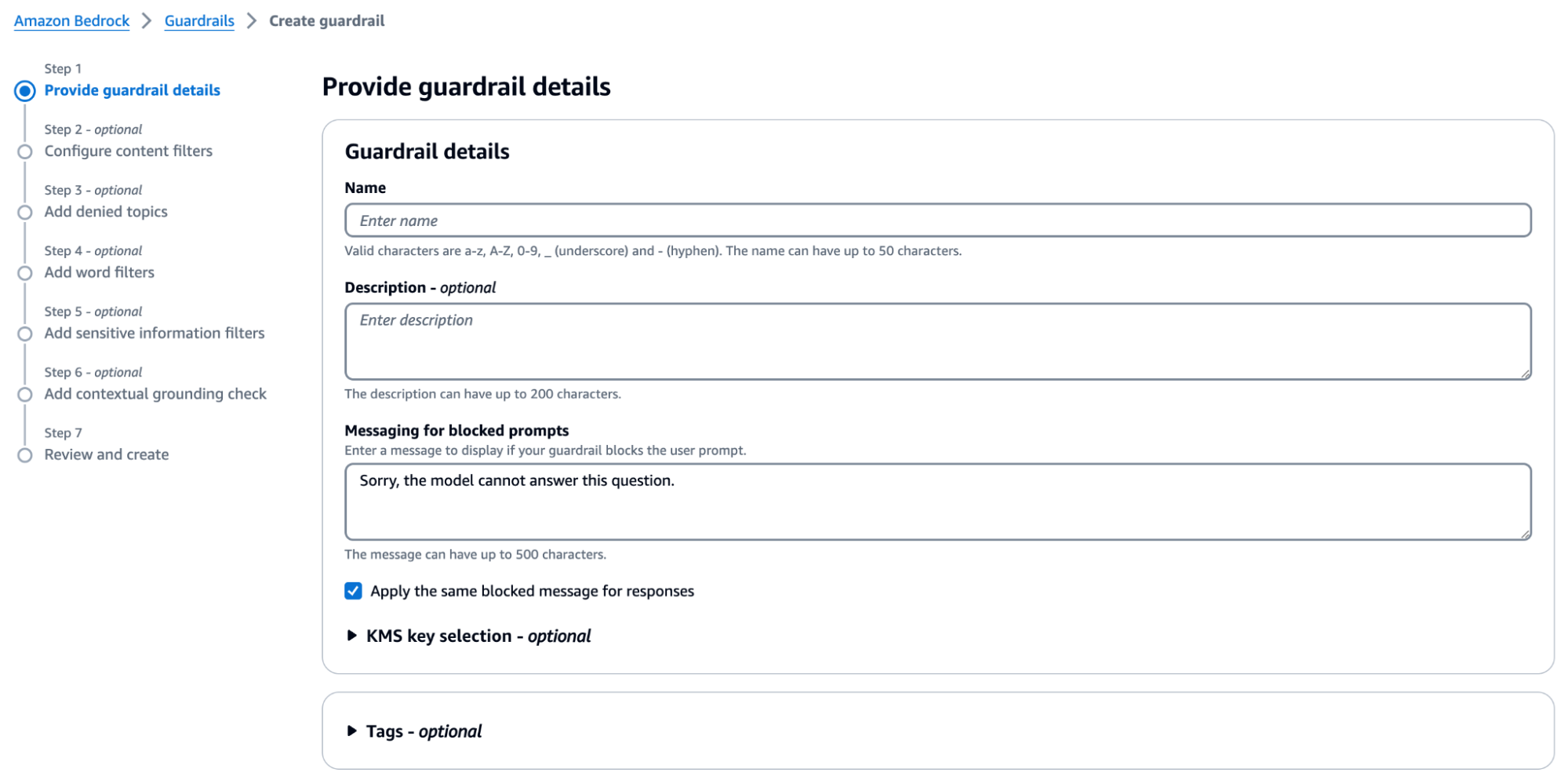 As shown in the console page image here reported, Amazon Bedrock Guardrails provides a set of filtering policies to prevent undesirable content and protect privacy in generative AI applications.
