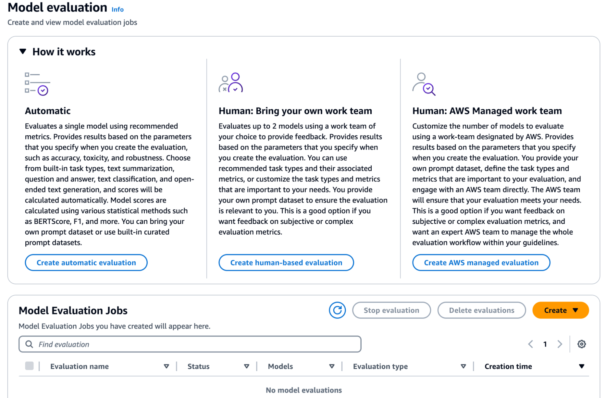 Automatic model evaluation jobs enable a quick assessment of a model’s ability to perform tasks, using either custom prompt datasets or built-in datasets. In contrast, model evaluation jobs with human workers allow for human input in the process, utilizing either employees or subject-matter experts from your industry. The process includes guidance on creating and managing these jobs, available performance metrics, and how to specify your dataset or use built-in ones.