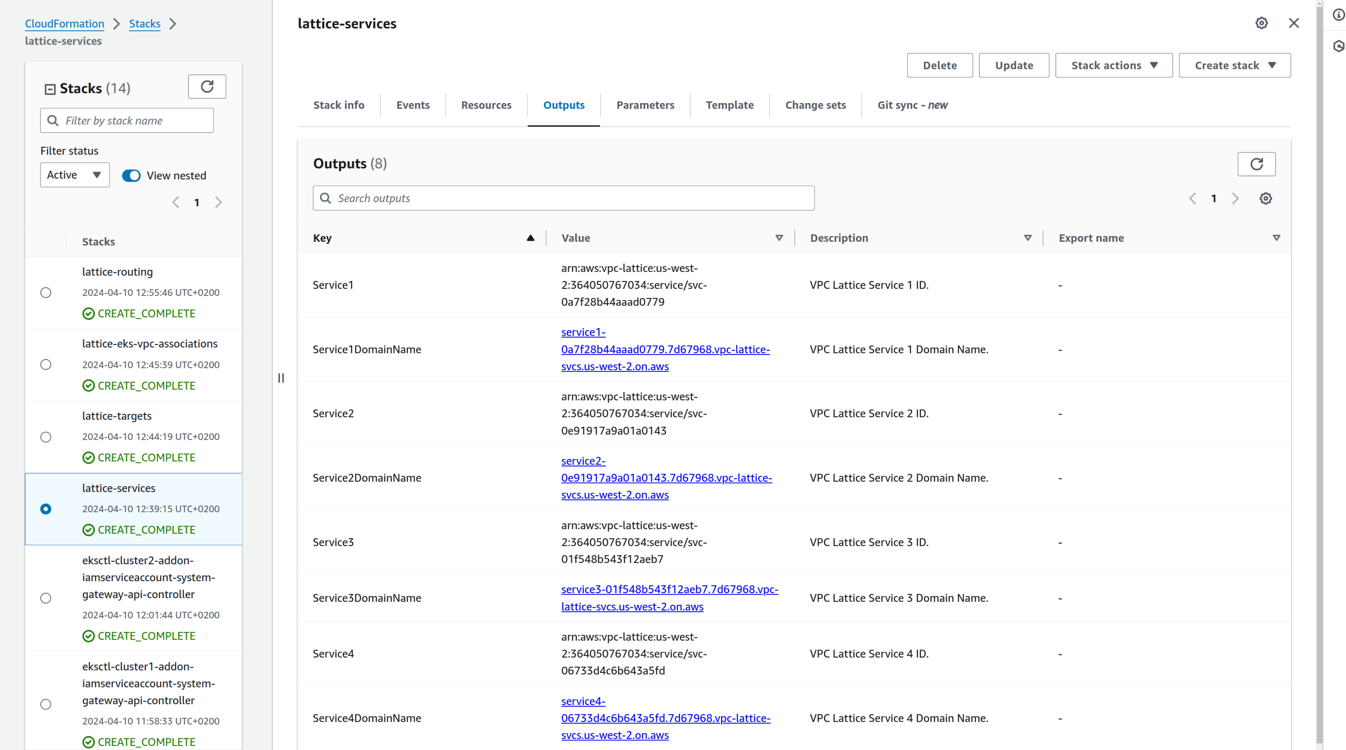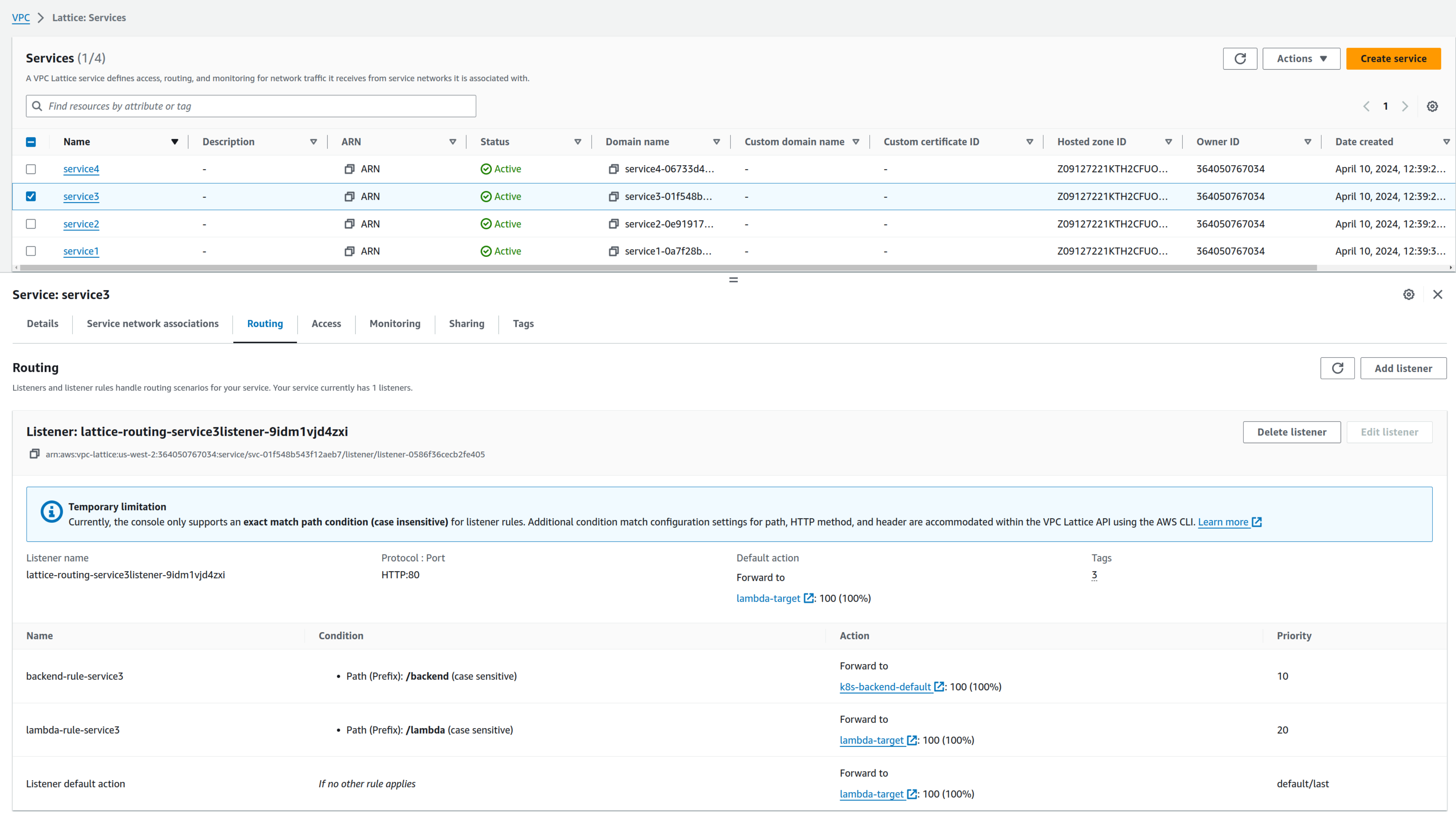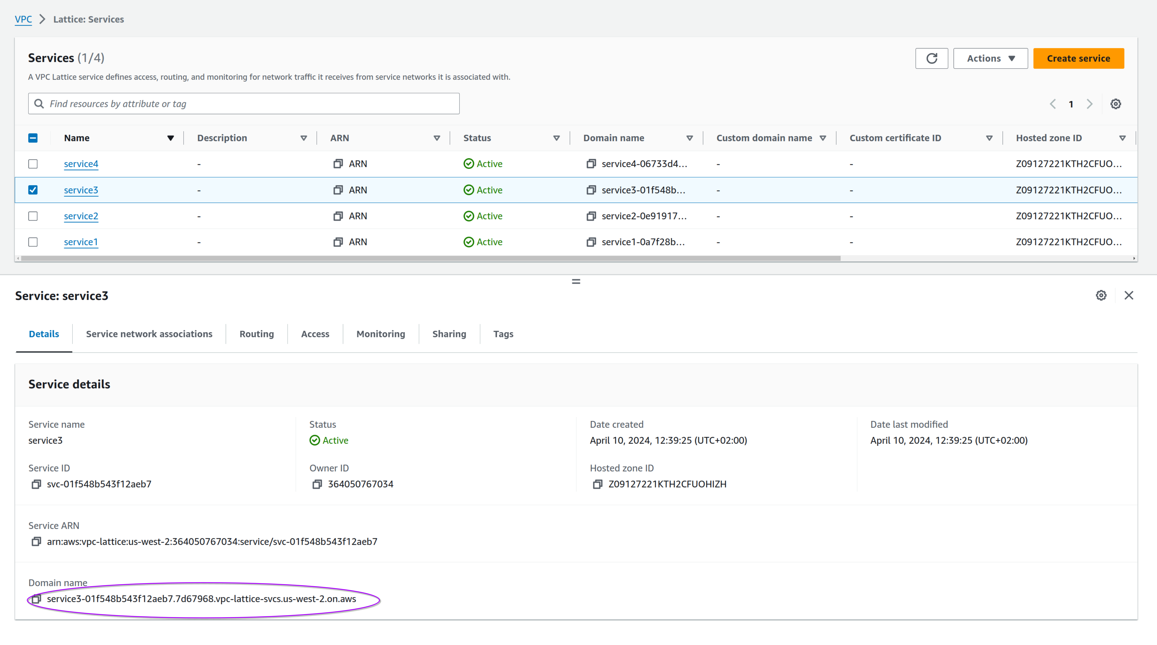 Last but not least, let's see the defined services. You can access them using the DNS domain name defined by VPC Lattice