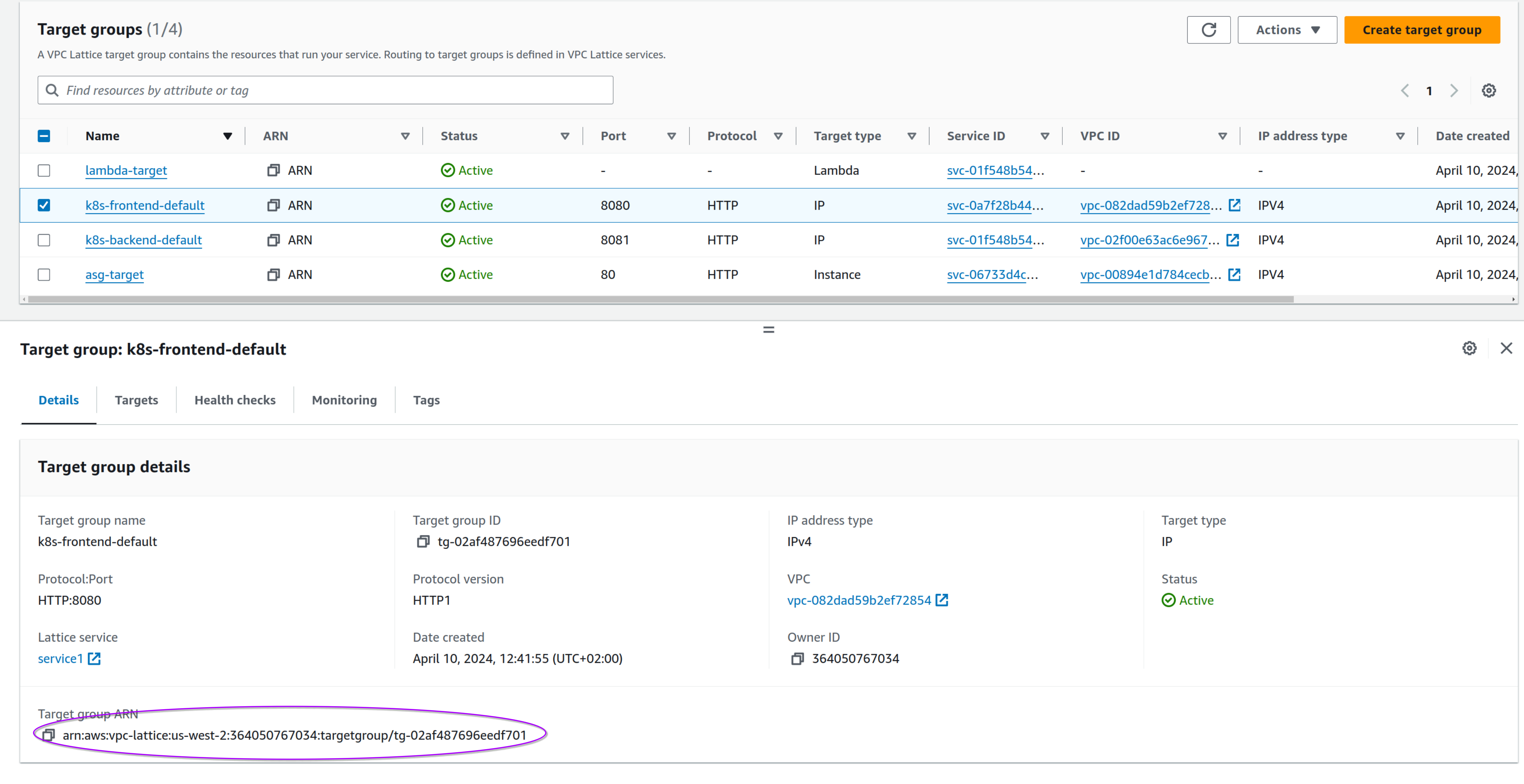 For TARGETCLUSTER1, use the k8s-frontend-default arn; for TARGETCLUSTER2, use the arn for k8s-backend-default. This is a sample from our deployment: