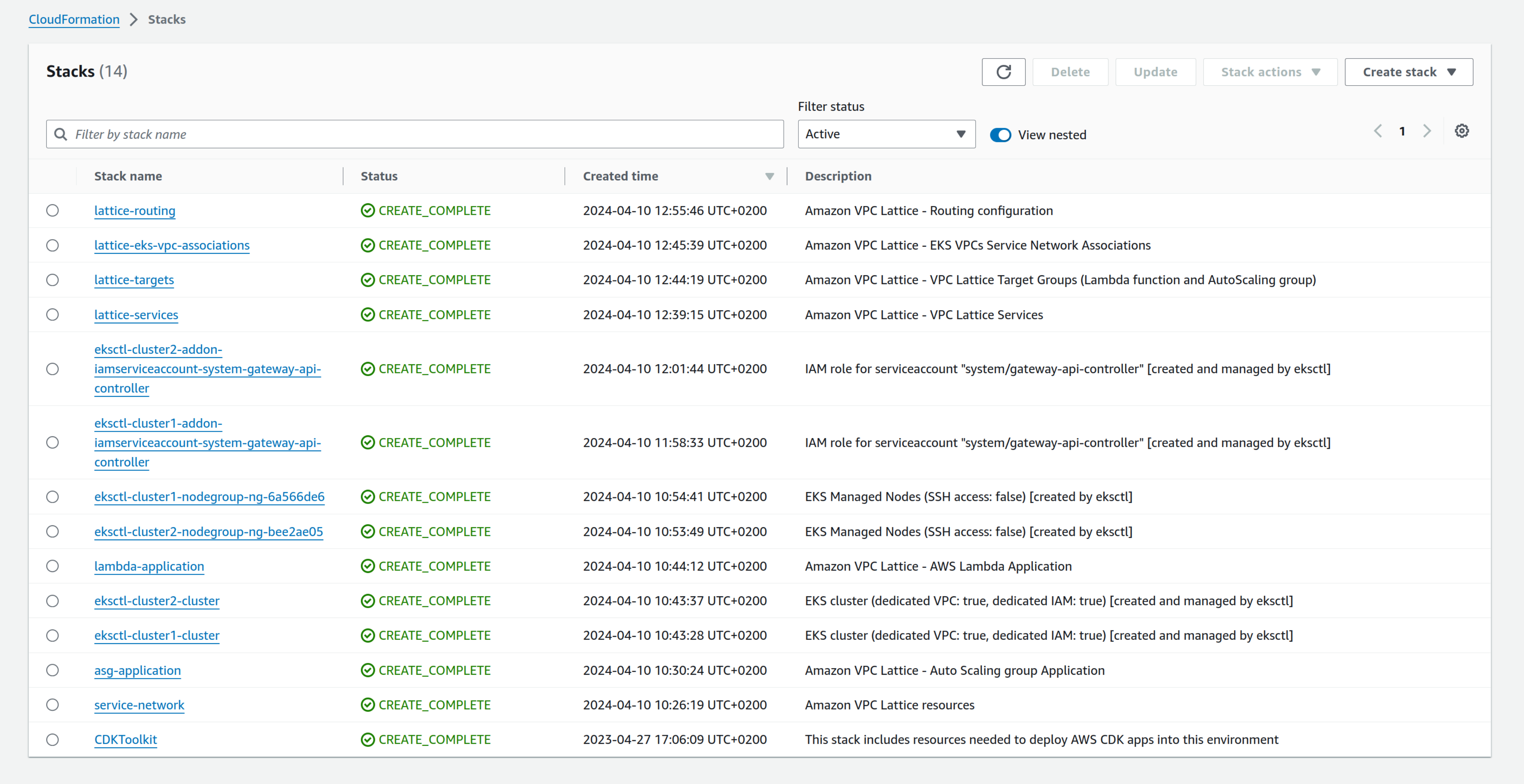 When the CloudFormation deployment finishes, you should have these CloudFormation stacks: