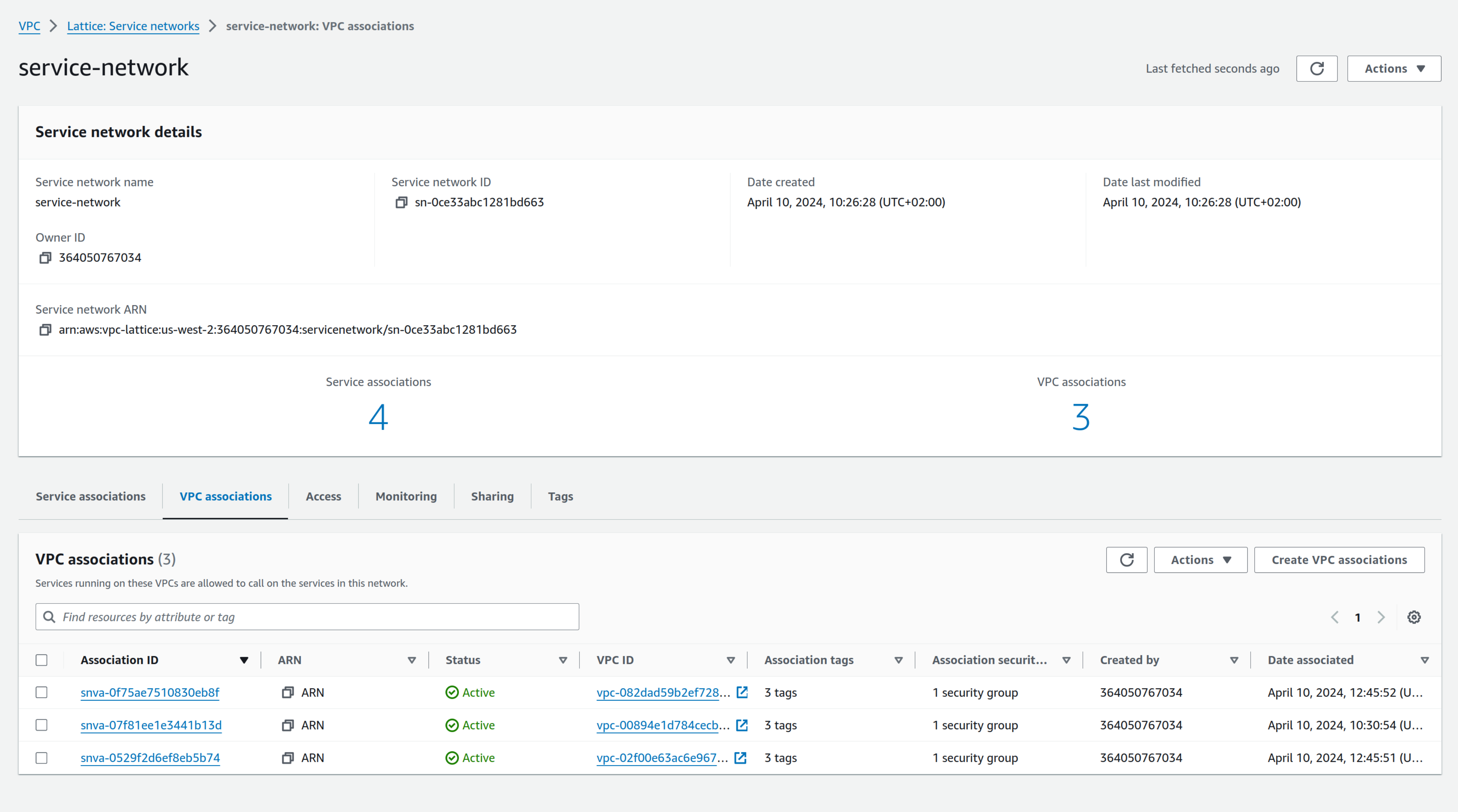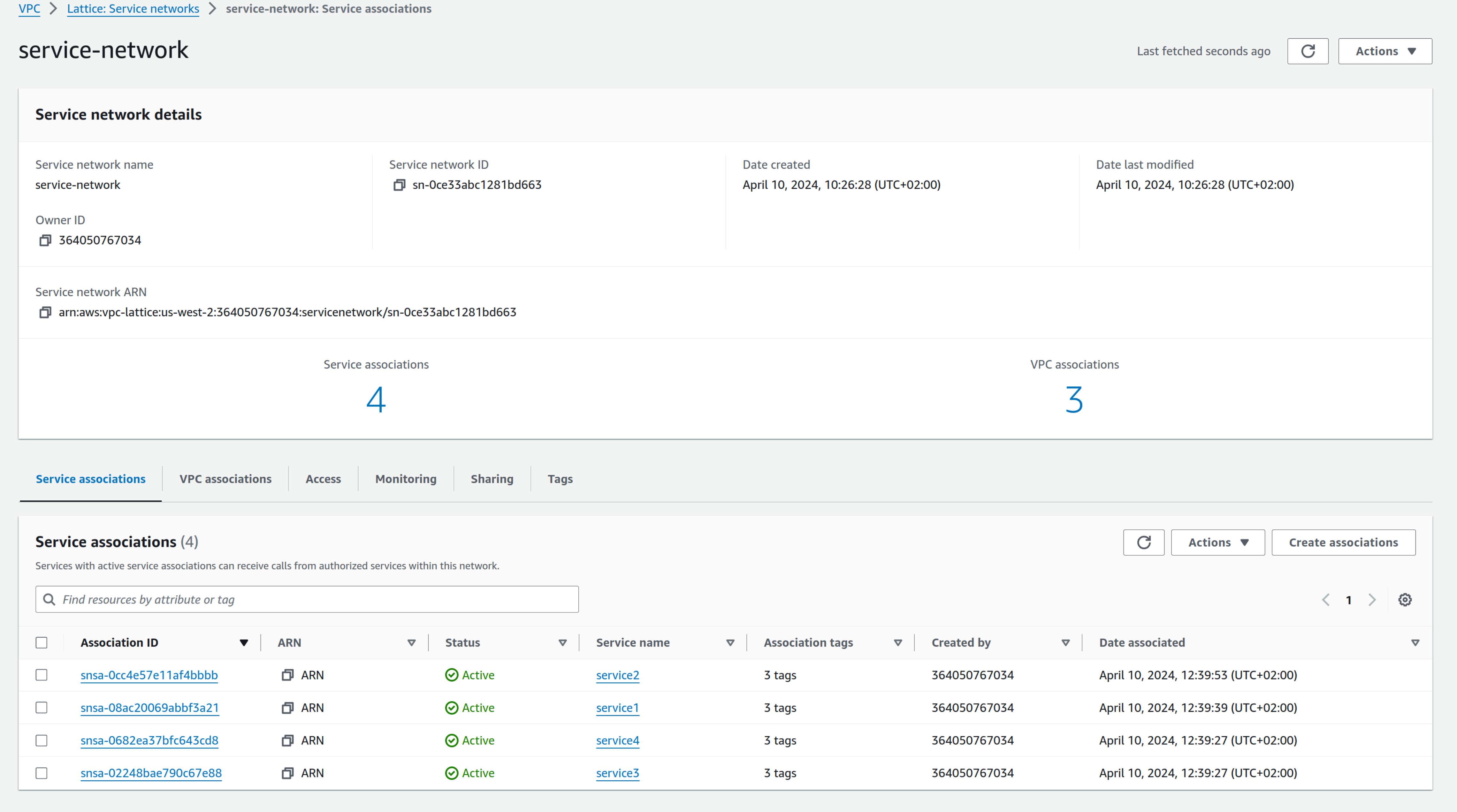 As you can see, four services are associated; you can also see VPCs associated with the service network: