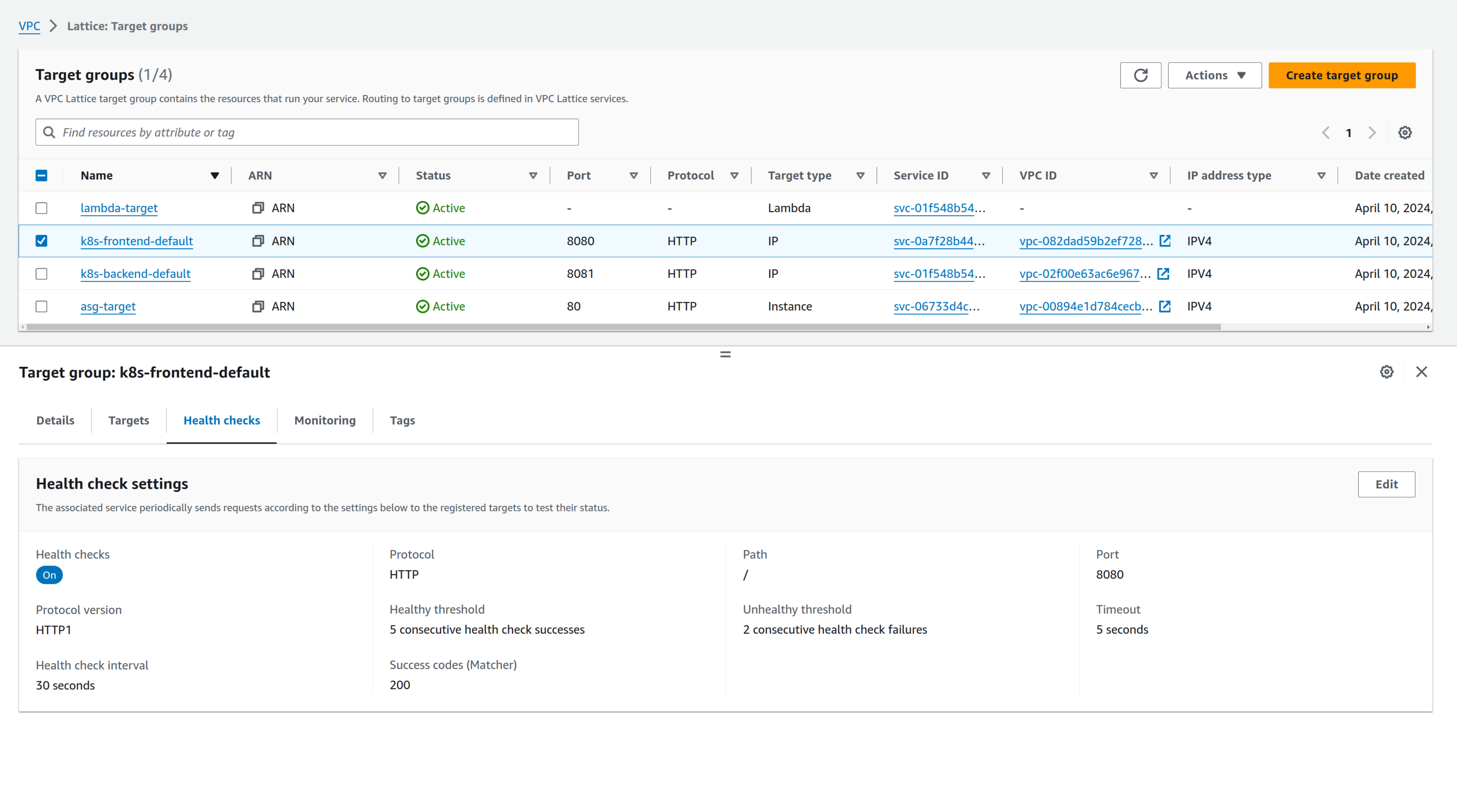 Our Lambda, Autoscaling group, and EKS are added as targets, and like ELB target groups, you can see metrics and define health checks.